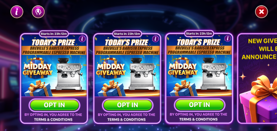 To view and register for the current Giveaways, please tap into the Giveaways Widget on the right side of the Lobby.