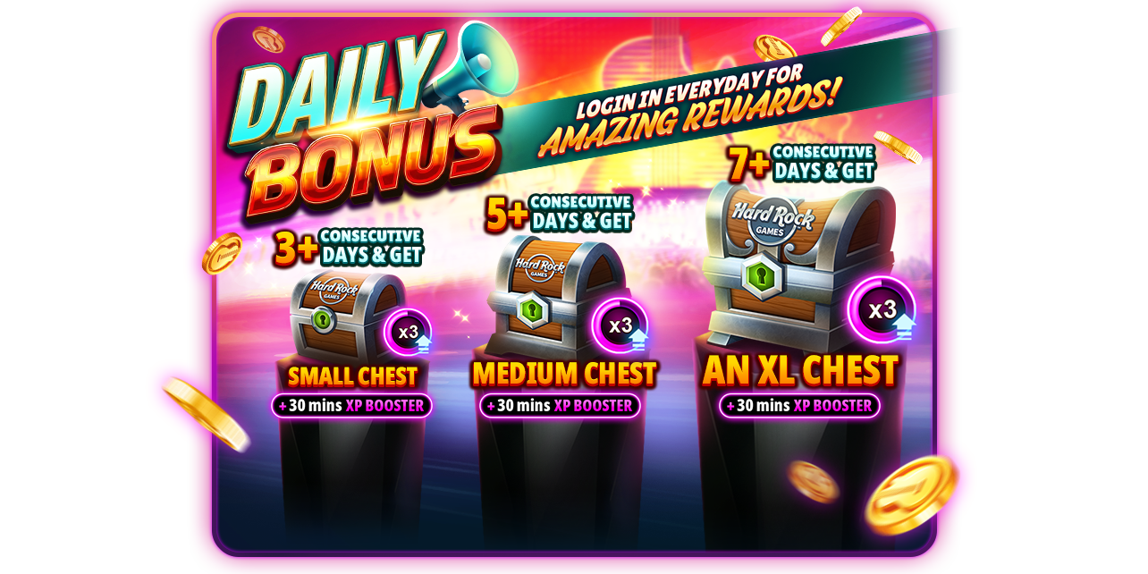 Login everyday for amazing rewards! 💰3+ Consecutive Login DaysEarn a Small Chest + 30 Min XP Boost 5+ Consecutive Login DaysEarn a Medium Chest + 30 Min XP Boost 7+ Consecutive Login DaysEarn an XL Chest + 30 Min XP Boost